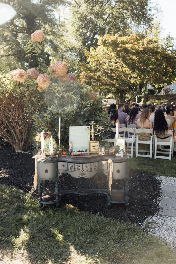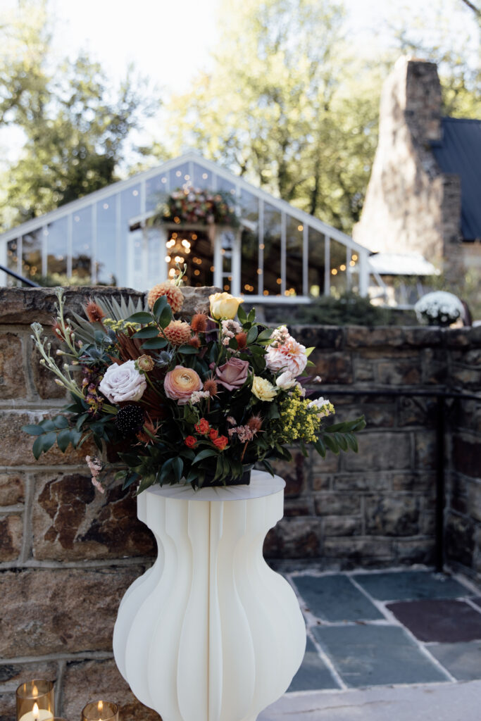 The ceremony took place outdoors, in Historic Shady Lane’s popular greenhouse terrace, surrounded by pink hydrangeas and early fall foliage. This ceremony site requires minimal additional décor, allowing florals and color palettes to complement the landscaping of the venue rather than compete with it.